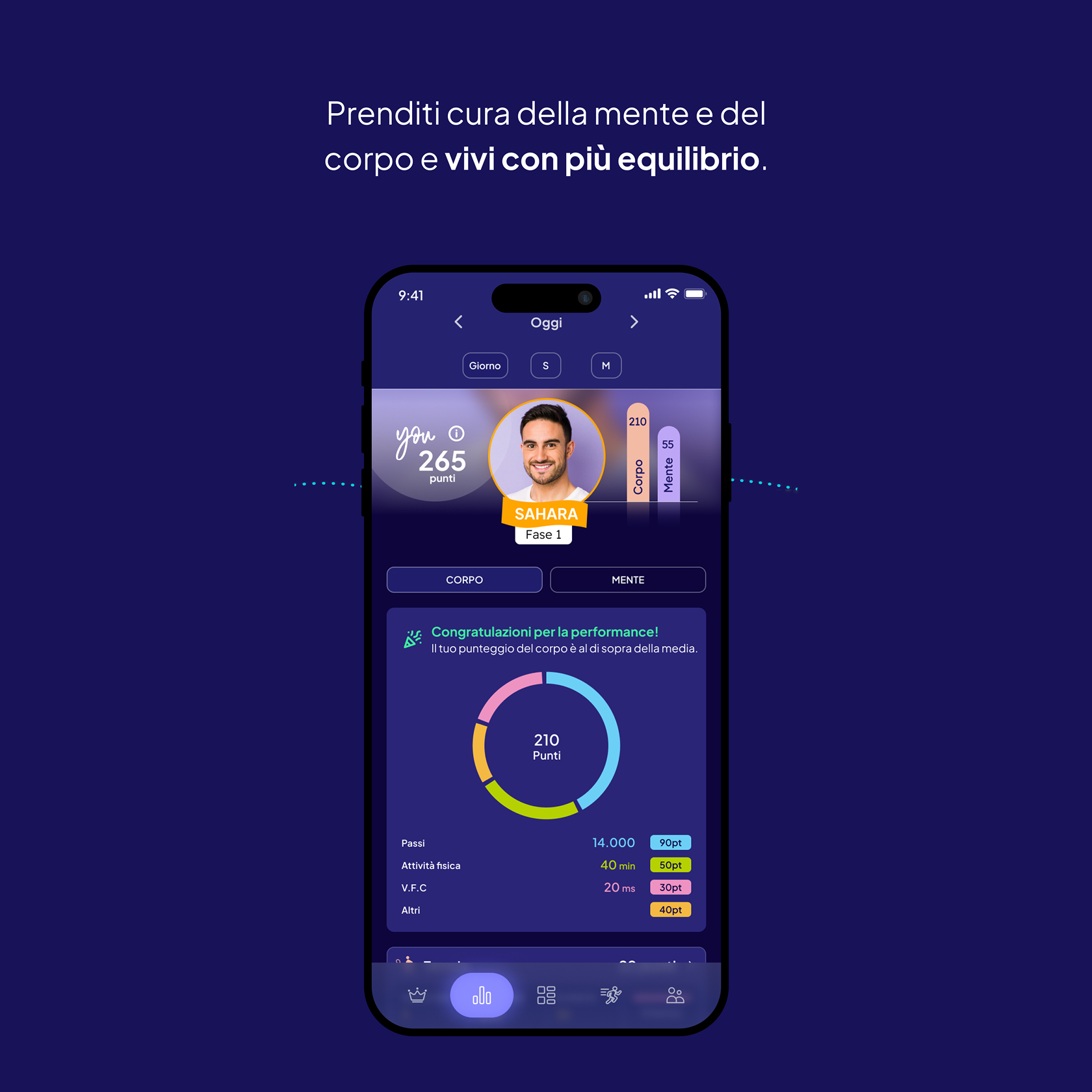 Tutto questo in un percorso gamificato, con leghe, ricompense e classifiche, che trasformano la cura della salute in un’esperienza motivante e continua.