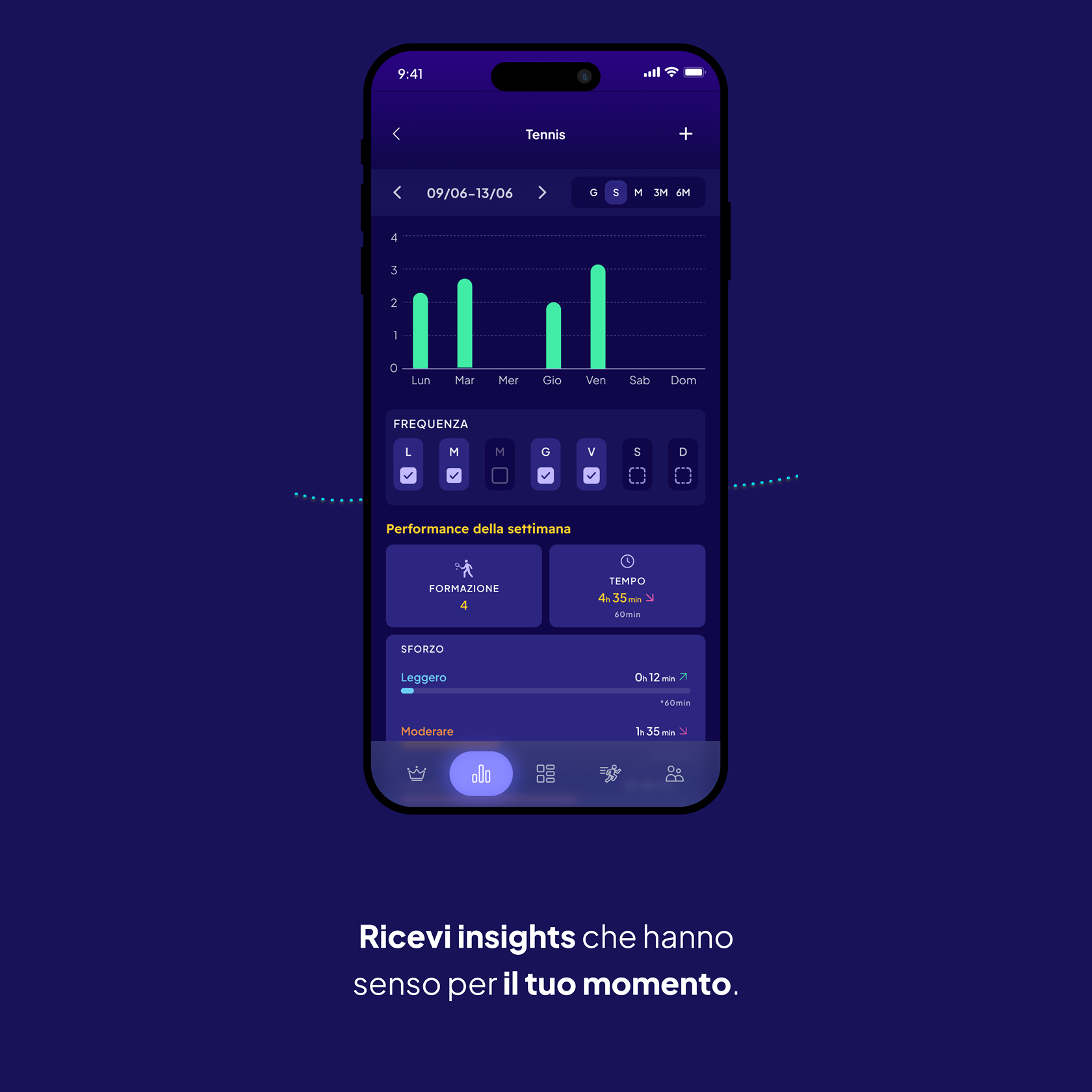 Ogni giorno, l’app imposta obiettivi intelligenti, adattati alla tua fase, al tuo stile di vita e al tuo livello di performance.