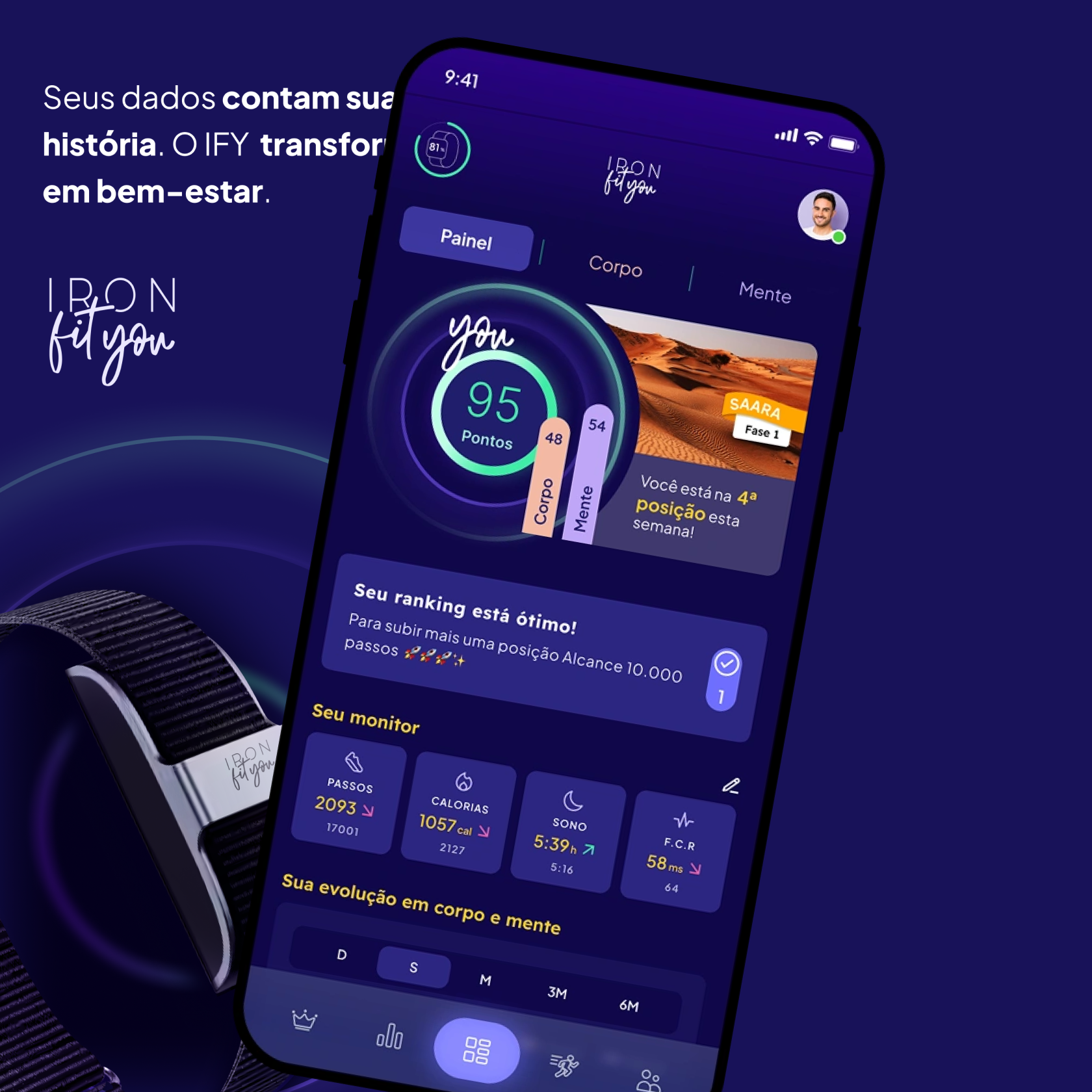 Com sensores de última geração e integração total ao app Iron Fit You, a pulseira acompanha seu ritmo 24 horas por dia — traduzindo seus dados em pontos, insights e recomendações personalizadas.