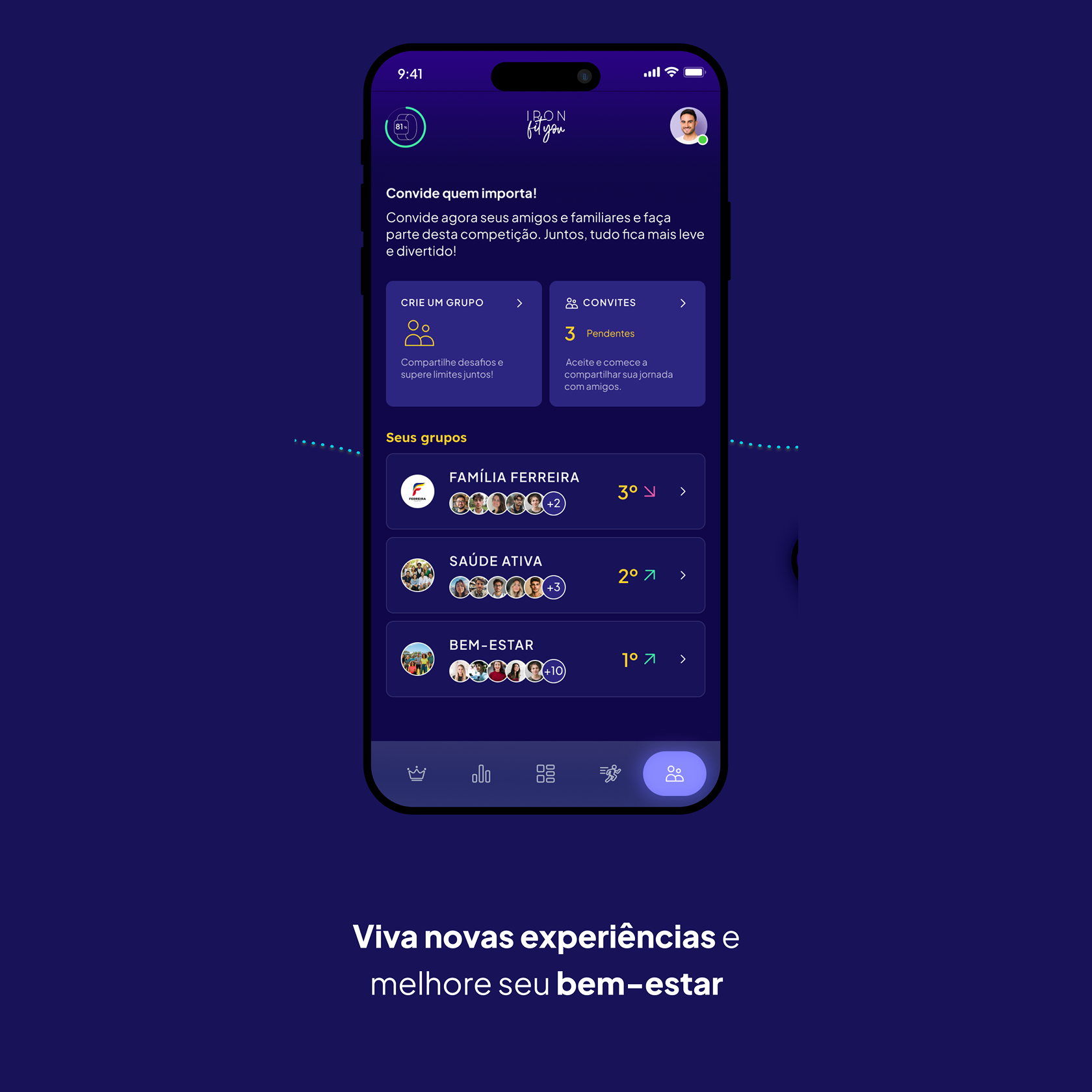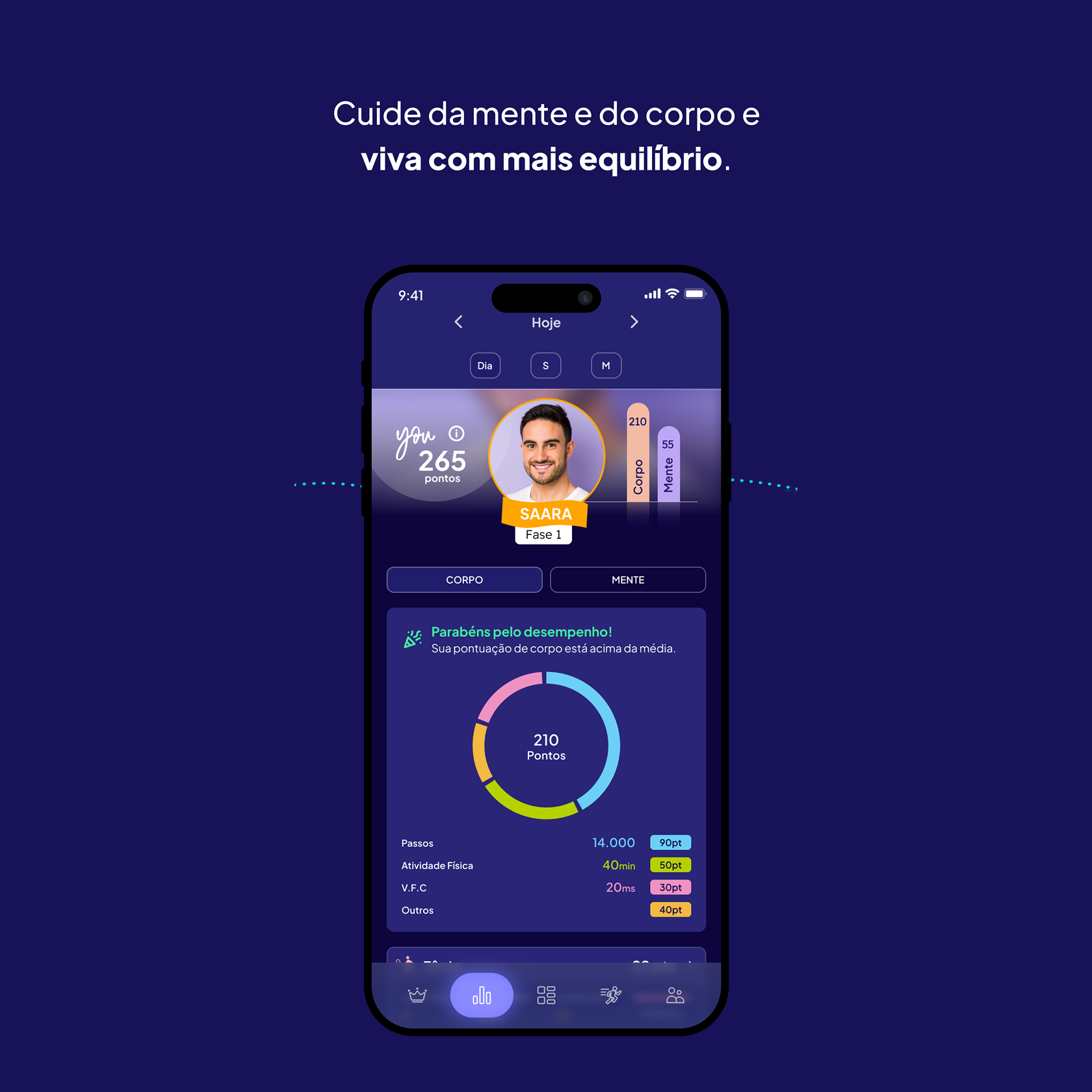 Tudo isso em uma jornada gamificada, com ligas, recompensas e rankings, que transformam o cuidado com a saúde em uma experiência motivadora e contínua.