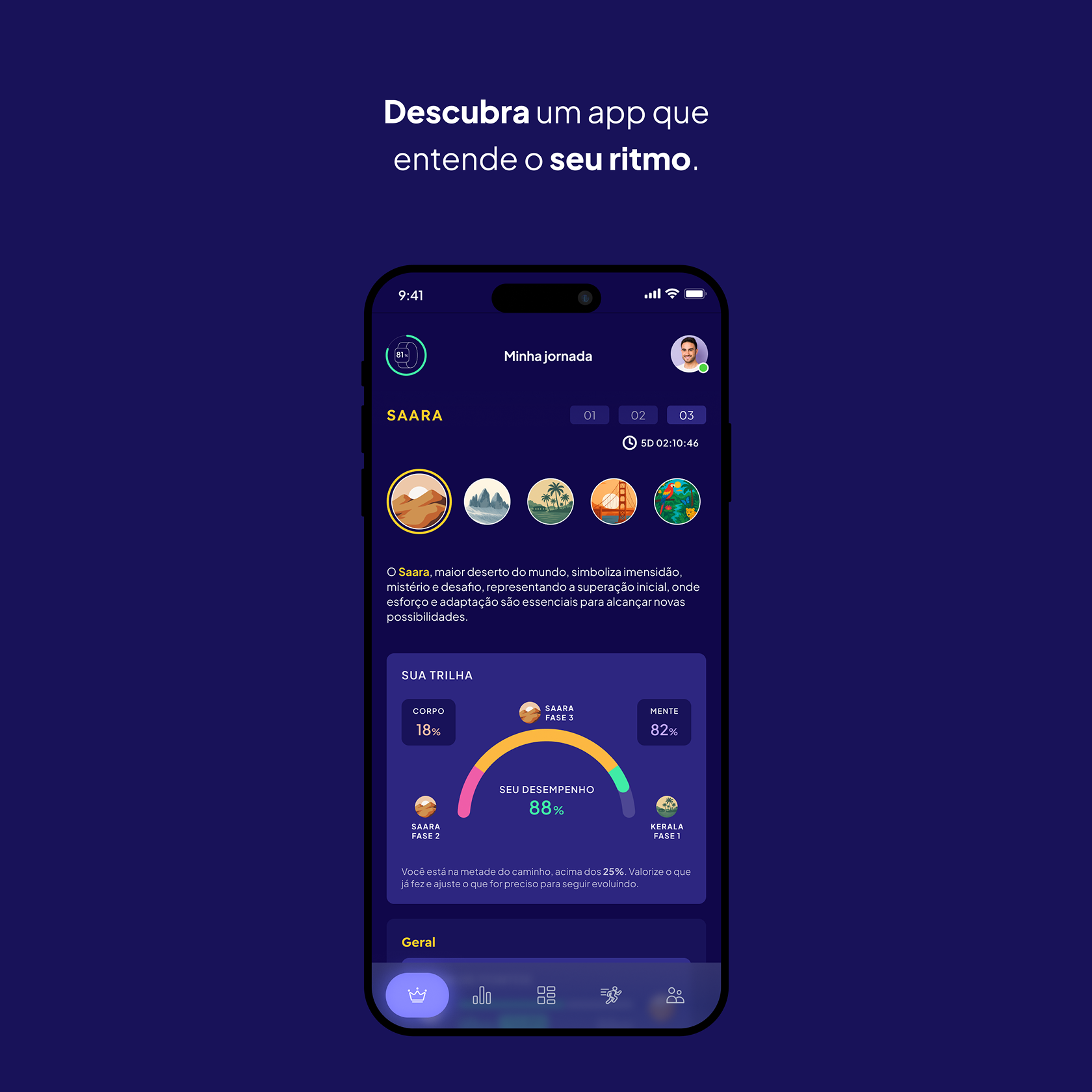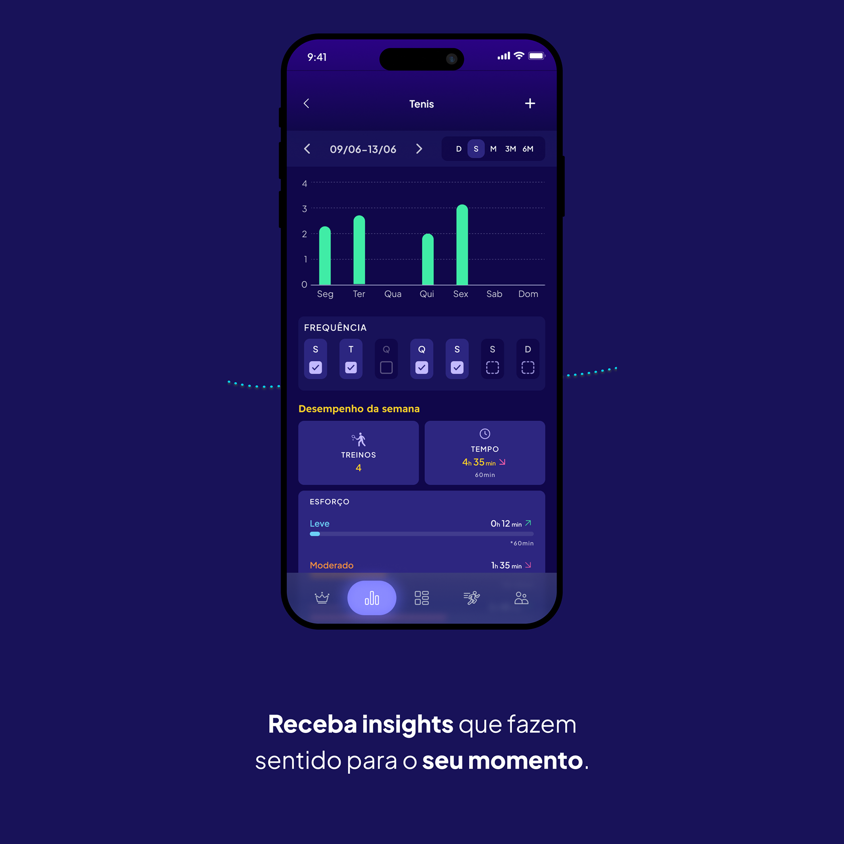 A cada dia, o app define metas inteligentes, ajustadas à sua fase, estilo de vida e nível de performance.